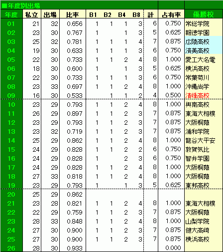 ■データ一覧■ ■対公立勝率グラフ■ ■大会別優勝比率グラフ■ ■年代別実績ポイントグラフ■ |
